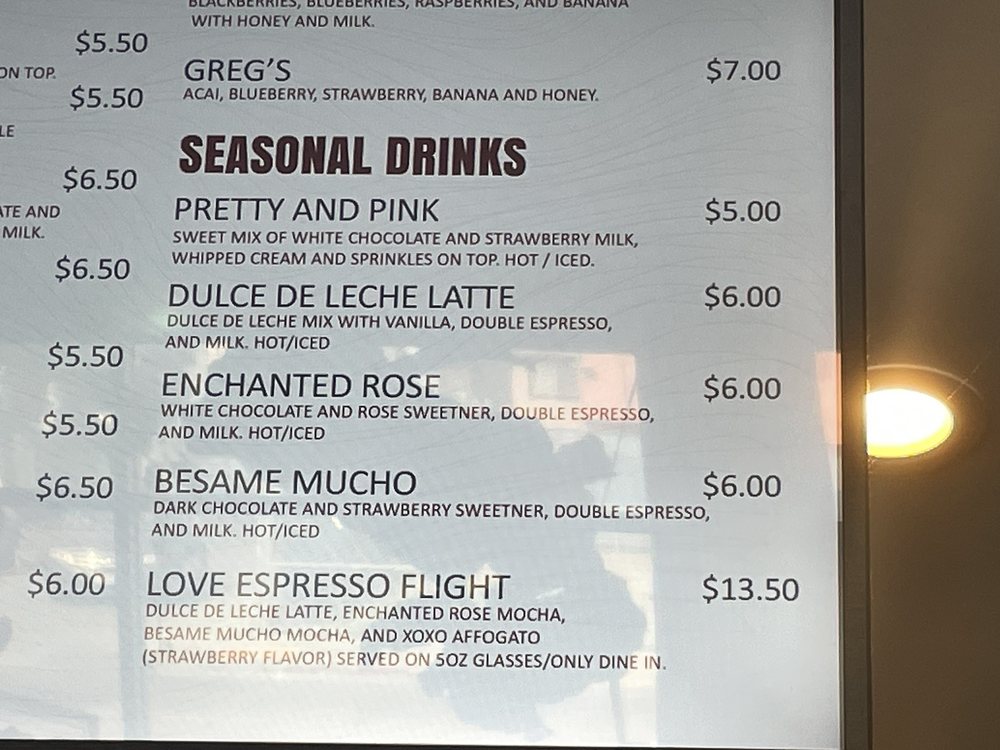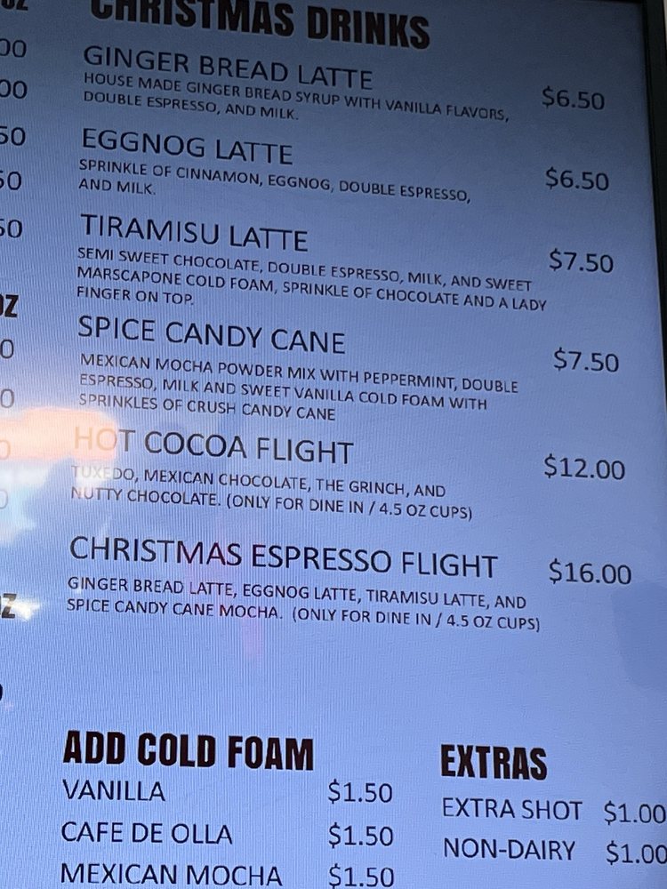 Ryan Bros City Heights is a cozy coffee shop located in San Diego, CA, offering a unique holiday espresso flight experience. Customers rave about the festive decorations, attentive service, and delicious coffee creations. Standout flavors include the rich tiramisu latte, creamy eggnog latte, and spicy gingerbread latte. The cafe also offers tasty sandwiches like the Jack's Pig on a croissant, adding to the overall dining experience. While seating may be limited, the welcoming atmosphere and free Wi-Fi make it a great spot for a casual coffee date or solo visit. For those with a sweet tooth, the holiday latte flight with almond milk is a must-try, showcasing inventive flavors like peppermint and eggnog. Overall, Ryan Bros City Heights impresses with its creative menu, friendly staff, and attention to detail in presentation.