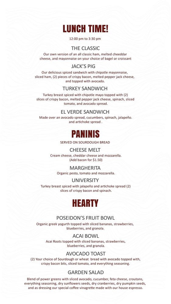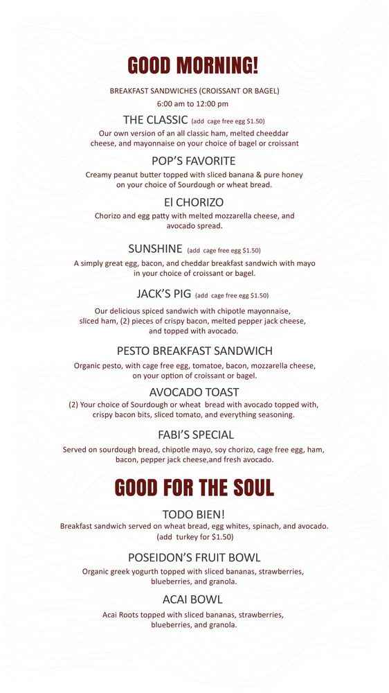 Served on sourdough bread, chipotle mayo, soy chorizo, cage free egg, ham, bacon, pepper jack cheese, and fresh avocado.